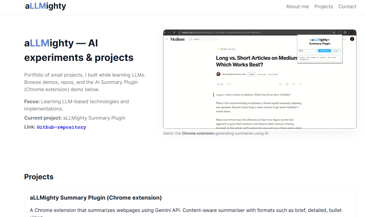 Portfolio of small projects, I built while learning LLMs. Browse demos, repos, and the AI Summary Plugin (Chrome extension).