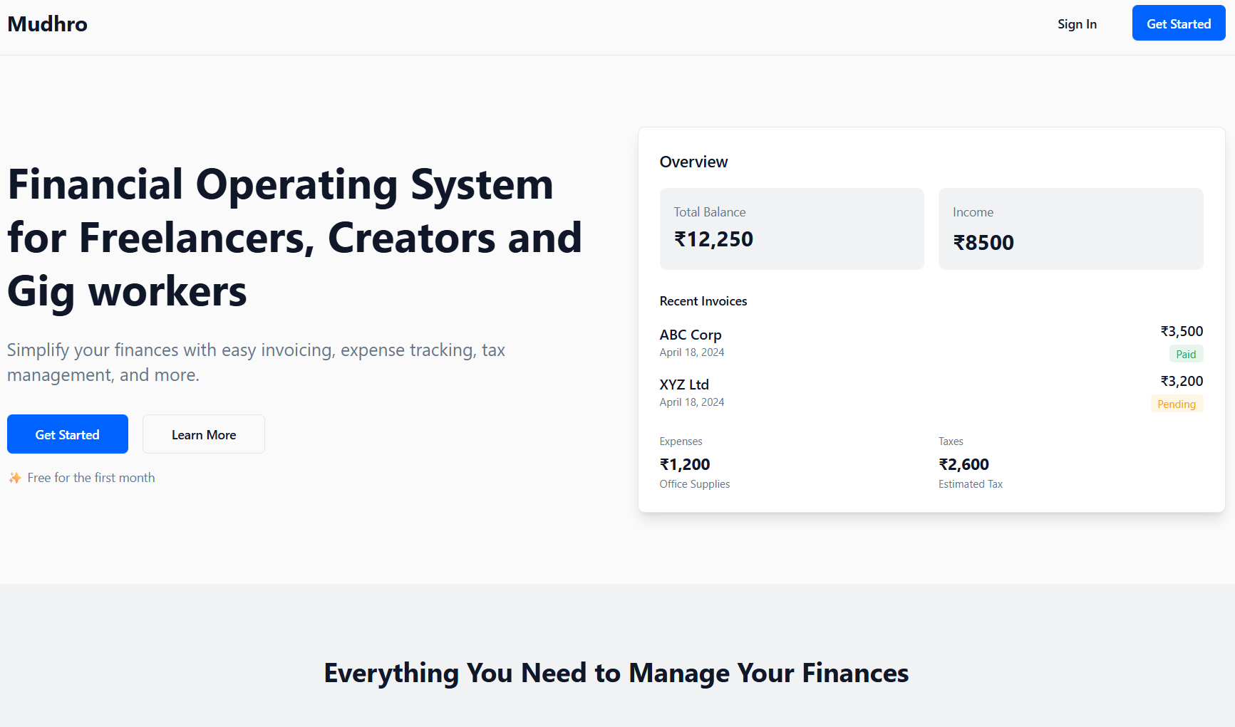 Led the frontend development for a startup, building Mudhro, a Financial OS for Freelancers, Creators and Gig workers. Collaborated remotely.